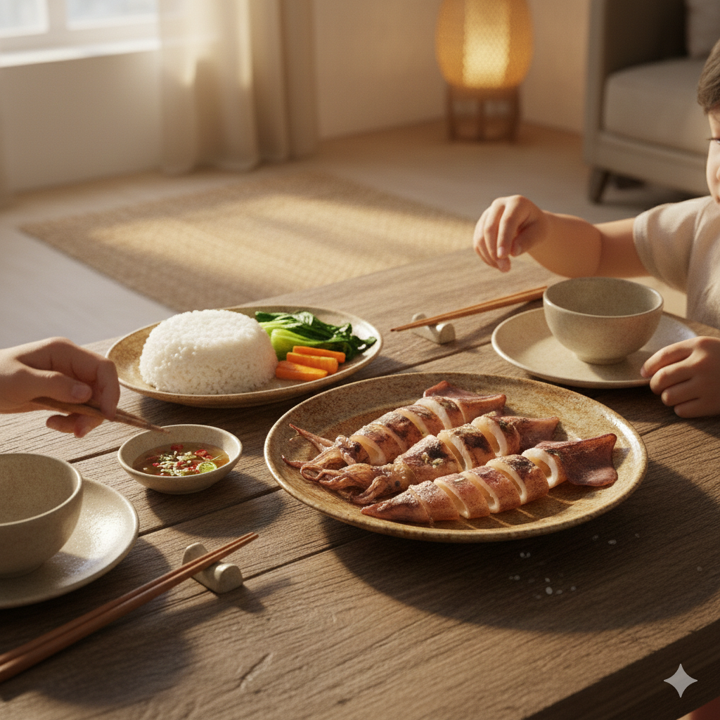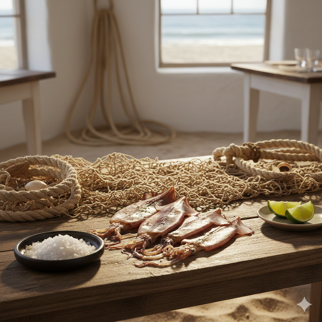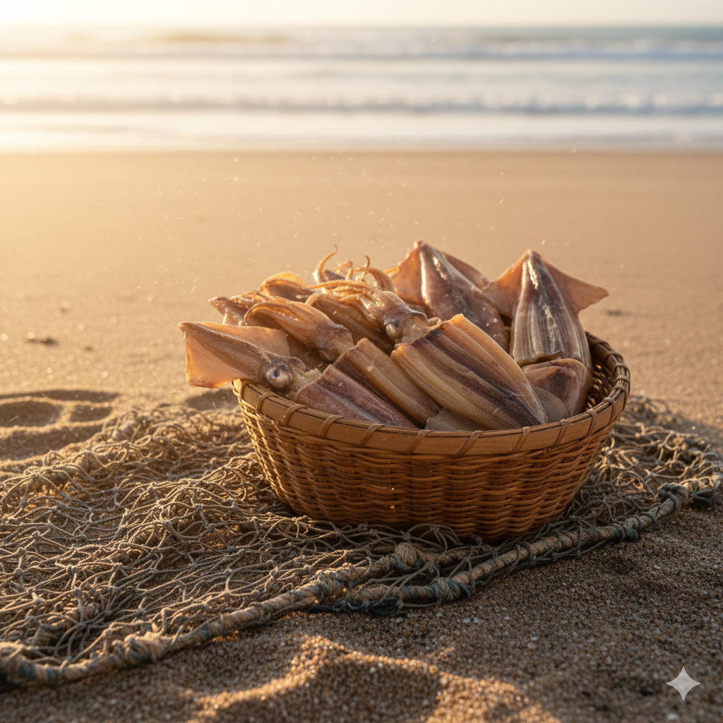 Lấy cảm hứng từ phương pháp phơi truyền thống của ngư dân Phan Thiết, mực lá được phơi đúng 1 nắng chuẩn – giúp lớp thịt dày vẫn mềm ngọt, thơm tự nhiên. Sản phẩm mang đậm tinh thần biển đảo: mộc mạc, tươi ngon và chân thật.