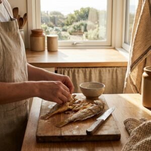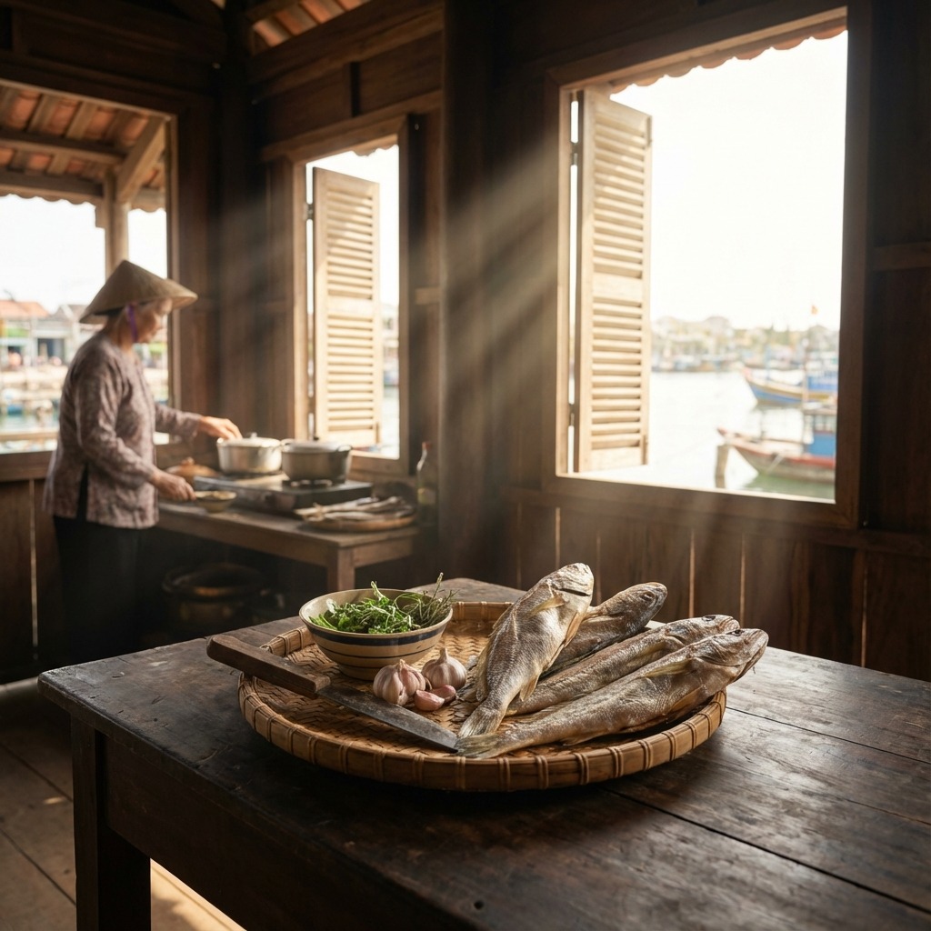 Cá khô đù là món cá gắn liền với bữa cơm quê và ký ức miền biển, thường xuất hiện trong những buổi chiều nhóm bếp than nướng cá, mùi thơm lan tỏa cả gian bếp. Cá được phơi vừa nắng để giữ độ dẻo, không khô cứng. TH Foods giữ trọn tinh thần mộc mạc – thân quen – đúng vị biển đảo.